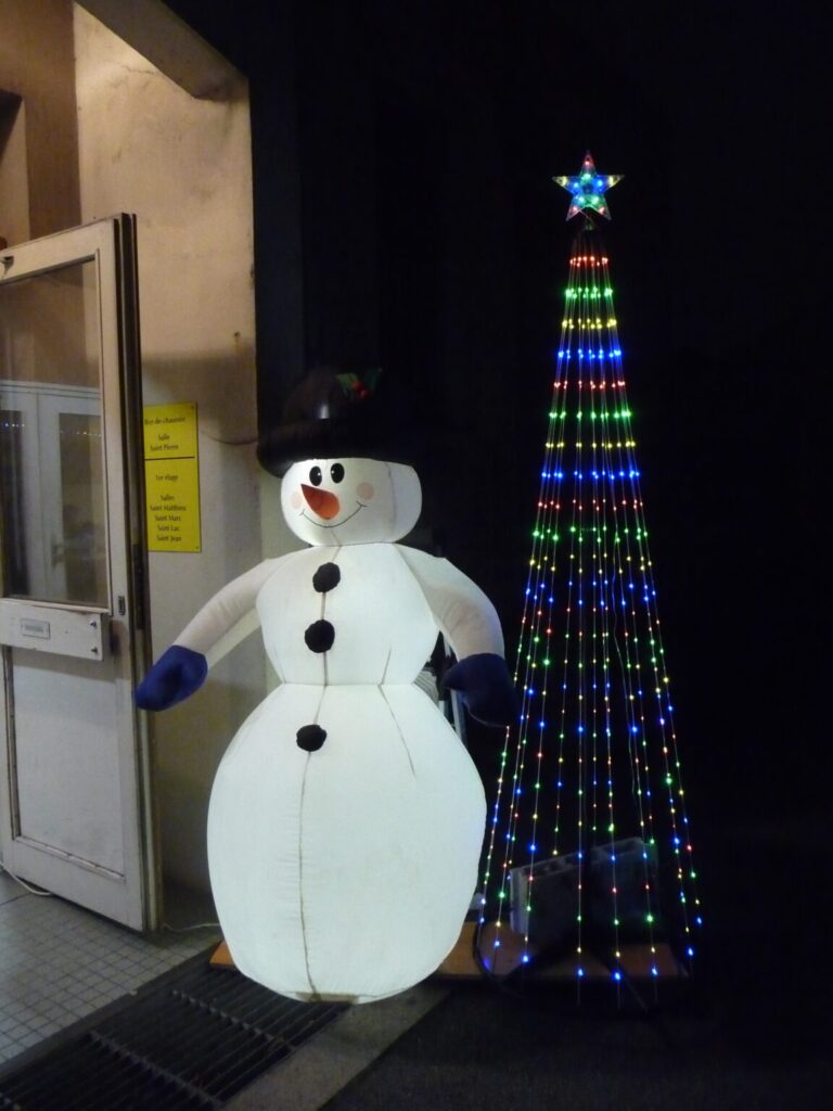 à la tombée de la nuit un bonhomme de neige nous accueil auprès de son sapin